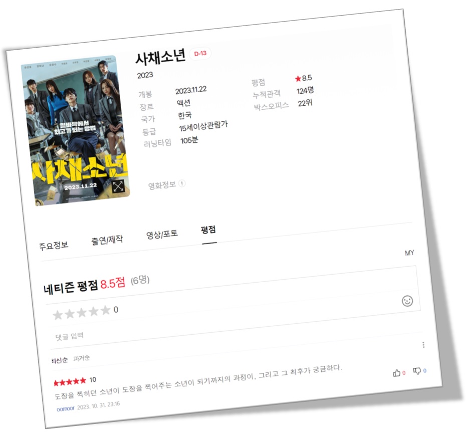 이 영화는 꿈도 희망도 없이 살아가던 최하위층의 고2 학생이 우연한 기회에 돈이라는 권력을 손에 쥐고 거침없이 질주하는 학교 액션 영화인데요. 서열 최하위의 학생이 어느 날 우연히 사채업을 시작하며 서열 1위가 되어가는 하이틴 범죄 액션입니다. 이 작품에서 라이징 스타들의 신선한 만남을 예고한 사채소년은 보도된 스틸 사진 속의 비주얼과 스토리를 흥미진진하게 담아내어 작품의 기대감을 높이고 있습니다.
